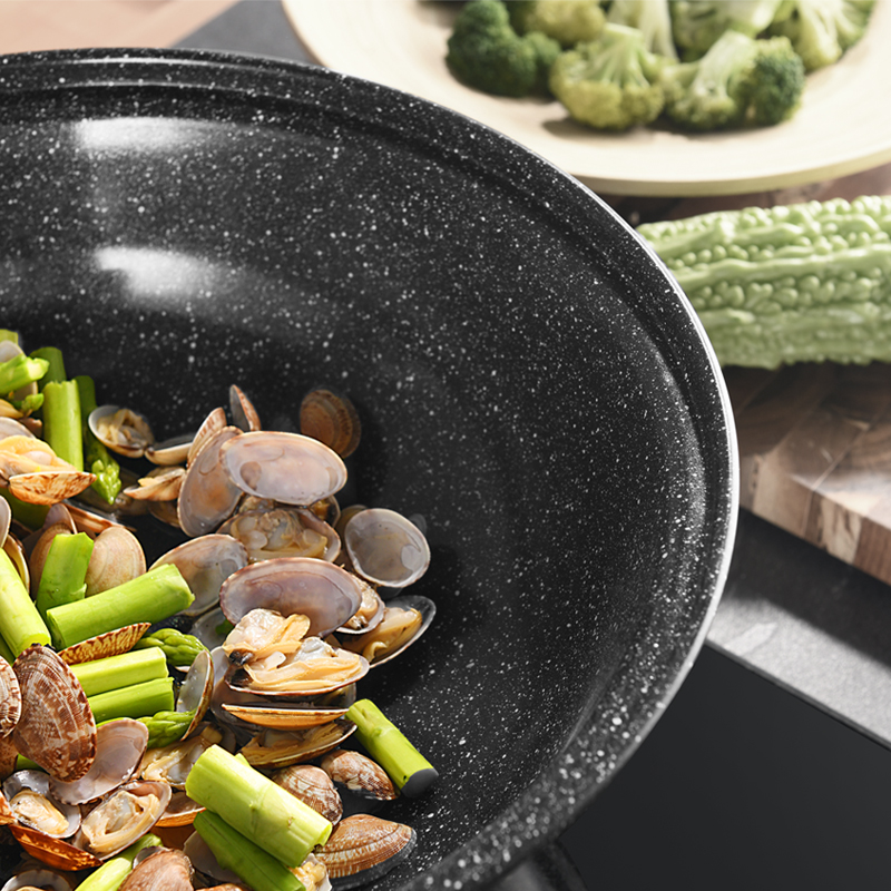 炒鍋是我國(guó)一種烹飪東西,為鍋的一種,特征是頂部開(kāi)口大,圓底,因?yàn)槲覈?guó)南邊食物多以小炒為主,故炒鍋規(guī)劃成有手柄以便當(dāng)拋炒。麥飯石微壓炒鍋首要用作煎或炒食物,但也能夠用作蒸、燉、炸等其他不同的烹飪方法。炒鍋是我國(guó)及東南亞的首要煮食東西。