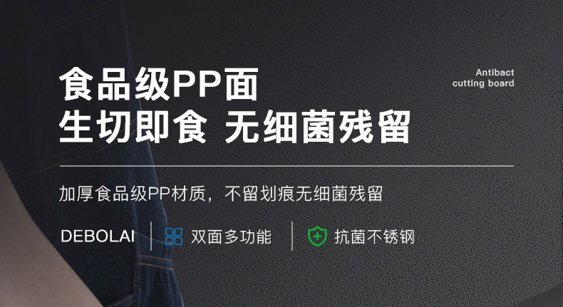 雙面菜板的出現(xiàn),解決了傳統(tǒng)菜板威脅健康的問(wèn)題。雙面菜板其優(yōu)點(diǎn)有重量輕、吸水性小、不易受潮開(kāi)裂、霉變、使用壽命長(zhǎng)、優(yōu)異的抗菌效果等。雙面菜板采用抗菌不銹鋼和食品級(jí)PP二合一,制成的雙面菜板起到持久性抗菌抗病毒效能。源自德國(guó)進(jìn)口的食品級(jí)PP材料無(wú)異味、剁骨不傷刀。即使菜板在使用過(guò)程中有一定的磨損,抗菌效果依然存在,為雙面菜板提供抗菌保護(hù),也為家人的健康保駕護(hù)航。