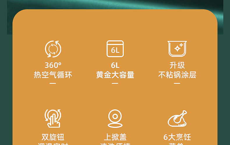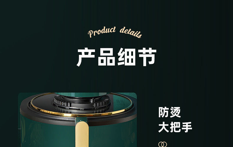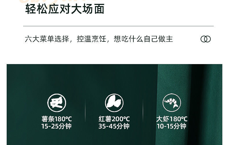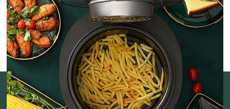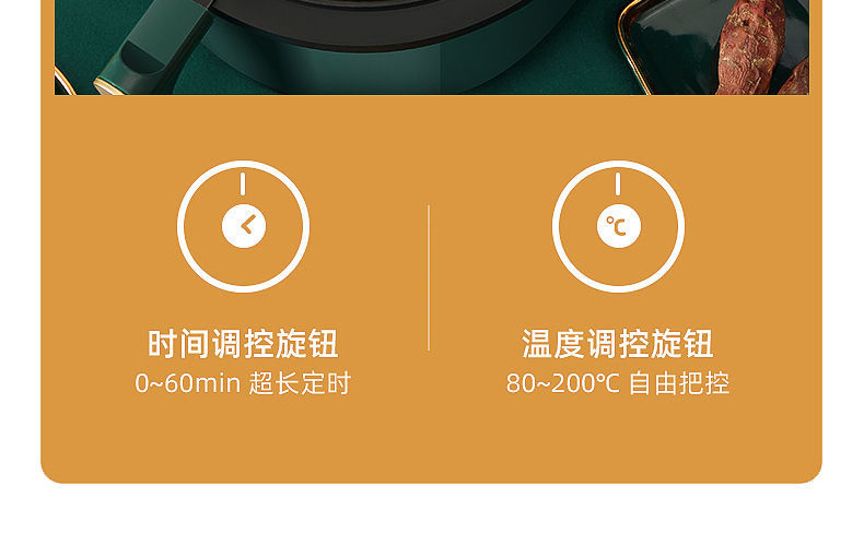 4、空氣炸鍋有最高達200度的恒溫裝置,是要設(shè)置好時間就不會產(chǎn)生傳統(tǒng)油炸過因為油溫太高產(chǎn)生食物焦糊甚至著火的情況。